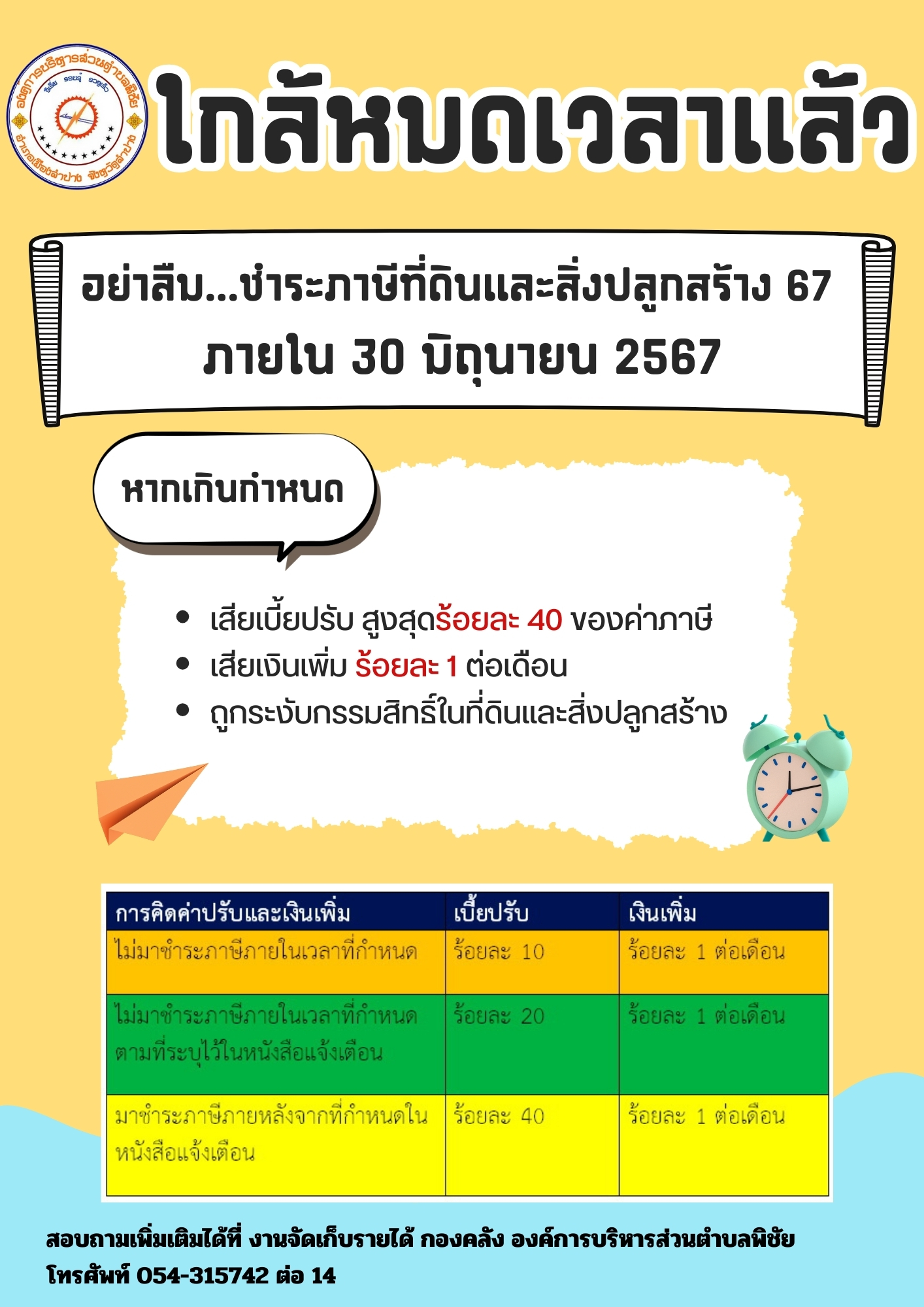 ประกาศแจ้งใกล้หมดเวลาชำระภาษีที่ดินและสิ่งปลูกสร้าง ประจำปี 2567 โดย อบต.พิชัย จนท. วันที่ มิ.ย. 12, 2024 Share FacebookTwitterGoogle+ReddItWhatsAppPinterestEmail