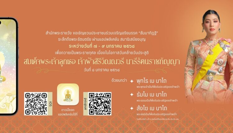 สำนักพระราชวัง ขอเชิญชวนประชาชนร่วมเจริญอริยมรรค “สัมมาทิฏฐิ” ระลึกถึงพระรัตนตรัย ว่าเป็นสรณะที่พึ่งที่ยึดถือ อันเป็นทางเป็นธรรมที่พระพุทธองค์ได้ตรัสไว้โดยชอบ เพื่อถวายเป็นพระราชกุศลเนื่องในโอกาสวันคล้ายวันประสูติ สมเด็จพระเจ้าลูกเธอ เจ้าฟ้าสิริวัณณวรี นารีรัตนราชกัญญา วันที่ ๘ มกราคม ๒๕๖๘ ผ่านแอปพลิเคชัน “สมาธิเสบียงบุญ” บันทึกเวลาการทำสมาธิเจริญจิตตภาวนา ตั้งแต่วันที่ ๗ มกราคม ๒๕๖๘ เวลา ๐๘.๐๐ น. ถึง วันที่ ๙ มกราคม ๒๕๖๘ เวลา ๐๘.๐๐ น. ทั้งนี้ สามารถ ดาวน์โหลดแอปพลิเคชันได้ทั้ง PLAY STORE และ APP STORE