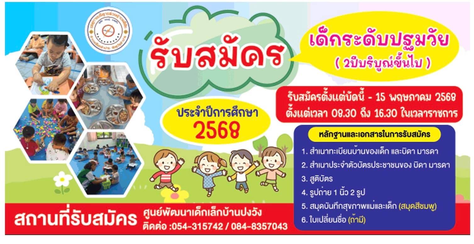 รับสมัครเด็กระดับปฐมวัย ประจำปีการศึกษา 2568 เข้าเรียนศูนย์พัฒนาเด็กเล็กสังกัดองค์การบริหารส่วนตำบลพิชัย (ศูนย์พัฒนาเด็กเล็กบ้านพิชัย(ค่ายสุรศักดิ์มนตรี ติดต่อ 054-315742/ 082-6189689) และศูนย์พัฒนาเด็กเล็กบ้านปงวัง ติดต่อ 054-315742/ 084-8357043)