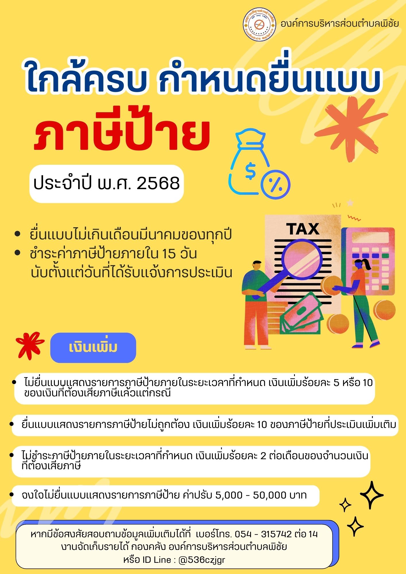 แจ้งประชาสัมพันธ์จากองค์การบริหารส่วนตำบลพิชัย เรื่องใกล้ครบกำหนดยื่นแบบภาษีป้าย ประจำปี พ.ศ.2568