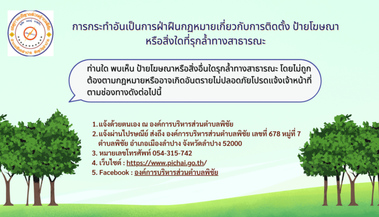 การกระทำอันเป็นการฝ่าฝืนกฎหมายเกี่ยวกับการติดตั้งป้ายโฆษณาหรือสิ่งอื่นใดที่รุกล้ำทางสาธารณะ โดย อบต.พิชัย จนท. วันที่ เม.ย. 21, 2025 ประชาสัมพันธ์เรื่อง การกระทำอันเป็นการฝ่าฝืนกฎหมายเกี่ยวกับการติดตั้งป้ายโฆษณาหรือสิ่งอื่นใดที่รุกล้ำทางสาธารณะ Share FacebookTwitterGoogle+ReddItWhatsAppPinterestEmail