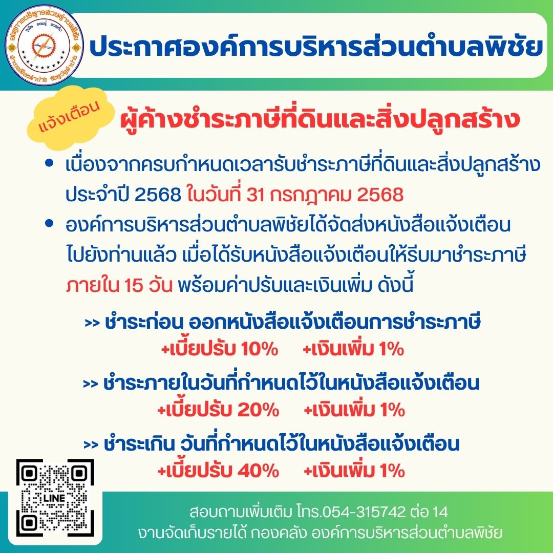 ประชาสัมพันธ์แจ้งเตือนการชำระภาษีที่ดินและสิ่งปลูกสร้าง ประจำปี 2568 โดย อบต.พิชัย จนท. วันที่ ส.ค. 1, 2025 ประชาสัมพันธ์แจ้งเตือนการชำระภาษีที่ดินและสิ่งปลูกสร้าง ประจำปี 2568 . ภาษีที่ดินเเละสิ่งปลูกสร้าง . หมดเขตชำระภาษี วันที่ 31 กรกฎาคม 2568 . หากเกินกำหนด เสียเบี้ยปรับ สูงสุดร้อยละ 40 ของค่าภาษี เสียเบี้ยปรับ ร้อยละ 1 ต่อเดือน ถูกระงับกรรมสิทธิ์ในที่ดินและสิ่งปลูกสร้าง . สอบถามข้อมูลเพิ่มเติมได้ที่ งานจัดเก็บรายได้ กองคลัง องค์การบริหารส่วนตำบลพิชัย โทร 054 – 315742 ต่อ 14 หรือ Line Official @536czjgr Share FacebookTwitterGoogle+ReddItWhatsAppPinterestEmail