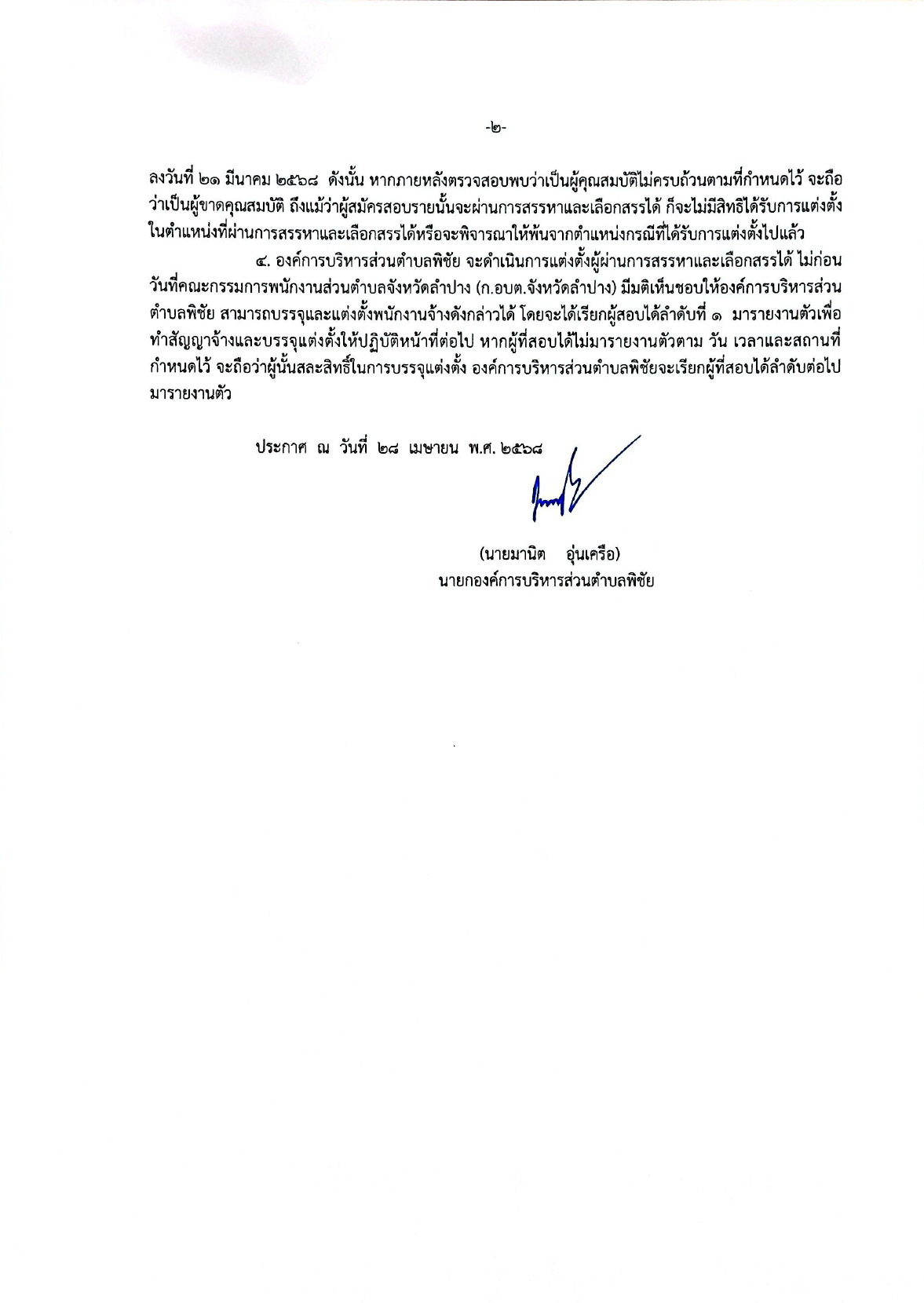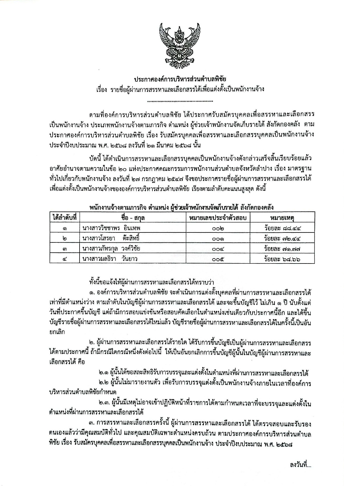 ประกาศองค์การบริหารส่วนตำบลพิชัย เรื่อง รายชื่อผู้ผ่านการสรรหาและเลือกสรรได้เพื่อแต่งตั้งเป็นพนักงานจ้าง รายละเอียดปรากฎตามเอกสารแนบท้ายประกาศนี้